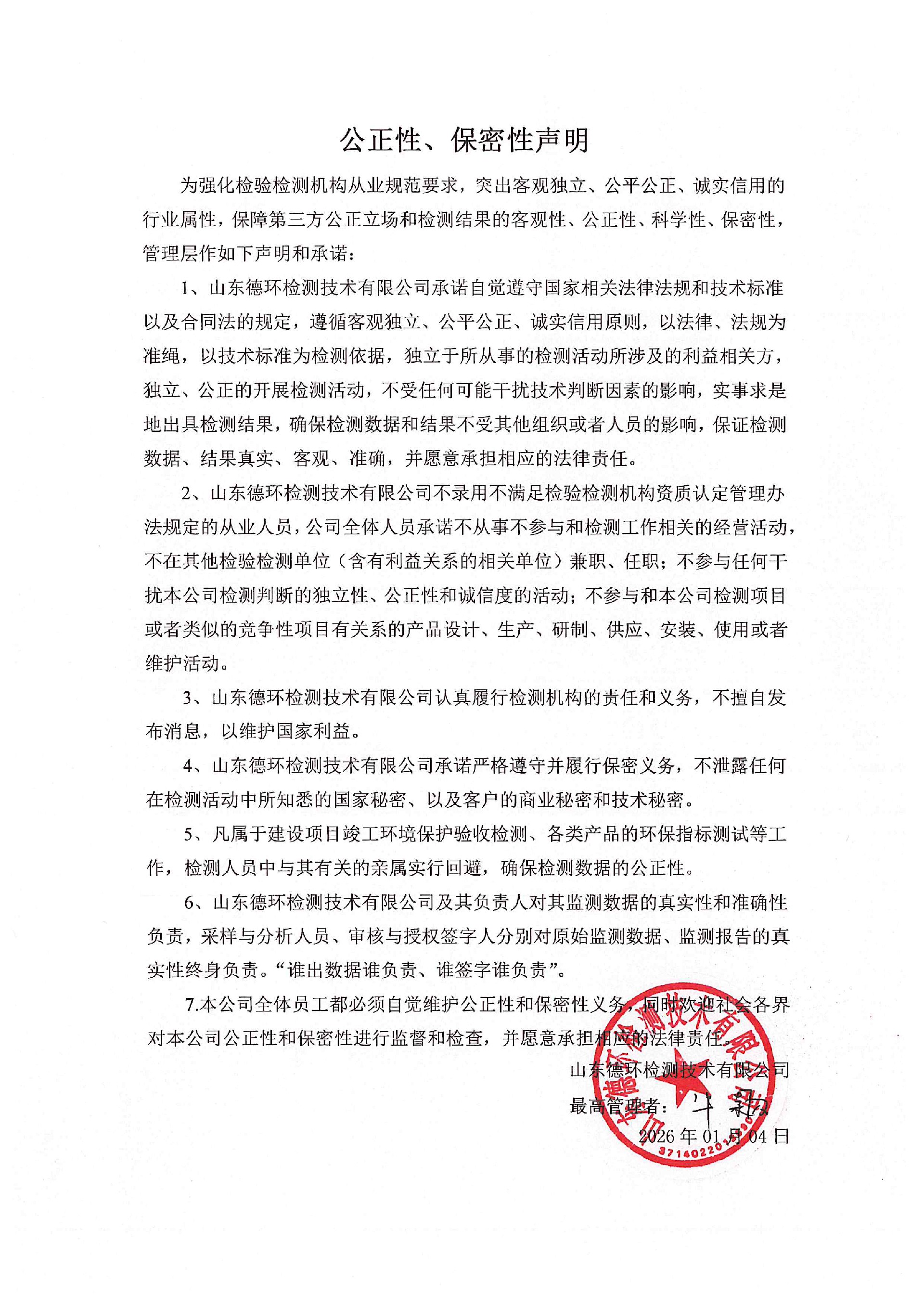 为强化检验检测机构从业规范要求,突出客观独立、公平公正、诚实信用的行业属性,保障第三方公正立场和检测结果的客观性、公正性、科学性、保密性,管理层作如下声明和承诺: 1、山东德环检测技术有限公司承诺自觉遵守国家相关法律法规和技术标准以及合同法的规定,遵循客观独立、公平公正、诚实信用原则,以法律、法规为准绳,以技术标准为检测依据,独立于所从事的检测活动所涉及的利益相关方,独立、公正的开展检测活动,不受任何可能干扰技术判断因素的影响,实事求是地出具检测结果,确保检测数据和结果不受其他组织或者人员的影响,保证检测数据、结果真实、客观、准确,并愿意承担相应的法律责任。 2、山东德环检测技术有限公司不录用不满足检验检测机构资质认定管理办法规定的从业人员,公司全体人员承诺不从事不参与和检测工作相关的经营活动,不在其他检验检测单位(含有利益关系的相关单位)兼职、任职;不参与任何干扰本公司检测判断的独立性、公正性和诚信度的活动;不参与和本公司检测项目或者类似的竞争性项目有关系的产品设计、生产、研制、供应、安装、使用或者维护活动。 3、山东德环检测技术有限公司认真履行检测机构的责任和义务,不擅自发布消息,以维护国家利益。 4、山东德环检测技术有限公司承诺严格遵守并履行保密义务,不泄露任何在检测活动中所知悉的国家秘密、以及客户的商业秘密和技术秘密。 5、凡属于建设项目竣工环境保护验收检测、各类产品的环保指标测试等工作,检测人员中与其有关的亲属实行回避,确保检测数据的公正性。 6、山东德环检测技术有限公司及其负责人对其监测数据的真实性和准确性负责,采样与分析人员、审核与授权签字人分别对原始监测数据、监测报告的真实性终身负责。“谁出数据谁负责、谁签字谁负责”。 7.本公司全体员工都必须自觉维护公正性和保密性义务,同时欢迎社会各界对本公司公正性和保密性进行监督和检查,并愿意承担相应的法律责任。 山东德环检测技术有限公司 2026年01月04日 微信图片_20260104090332.jpg